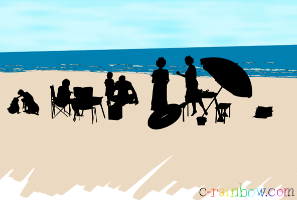 解説 : 夏休みに海に行きました。もちろん写真撮りまくりです(笑)。その中に逆光でよく解らなくなってしまった、撮り損ねた写真がありました。なら、いっそのことイラストにしてみたらどうだろうという発想で描いたのがこれです。人物は思い切ってシルエットのみにしてみました。