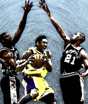 ゴール下の攻防。コービー・ブライアントのシュートを止めにいくスパーズのツインタワー、デイビット・ロビンソンとティム・ダンカン。