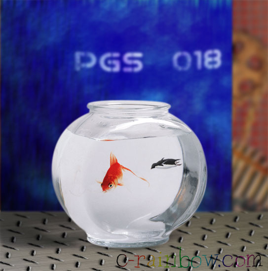 解説 : 金魚鉢の中でありえない位小さいペンギンが金魚を追いかけてる絵です。ペンギンは直立している写真を切取り、変形させて配置し、金魚鉢の壁面と水面に影を入れました。金魚と金魚鉢は写真です。工場のステップに置いてあるイメージで、背景とステップの縞鋼板は自作です。