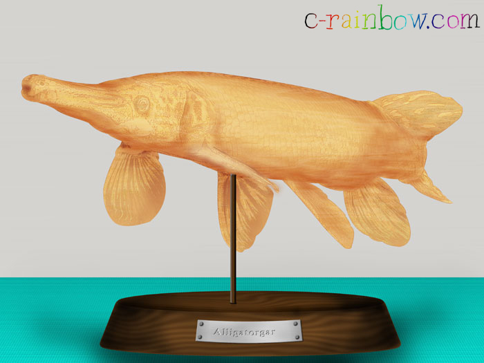 木材をナイフなどで削って本物そっくりの鳥などを作ることをウッドカービングといいますが、魚を彫ったものをイラストに描いてみました。魚はアリゲーターガーというワニに似た口を持つ古代魚です。