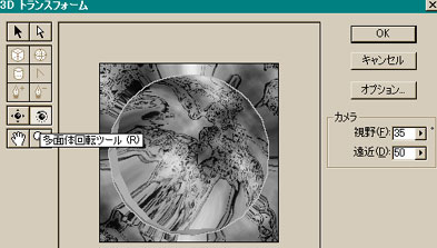 最初に「フィルタ」−「変形」−「球面...」とクリックし、開かれたダイアログで量を