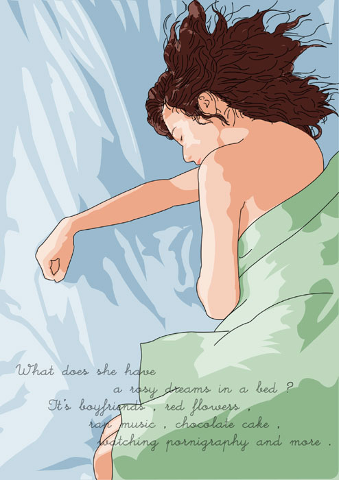 タイプ A 夢を見る女性 アニメのセル画のように、ベタ塗りに光と影を描き込んで作ったものです。作例では写真を元にしていますので、手描きは一切していません。 |